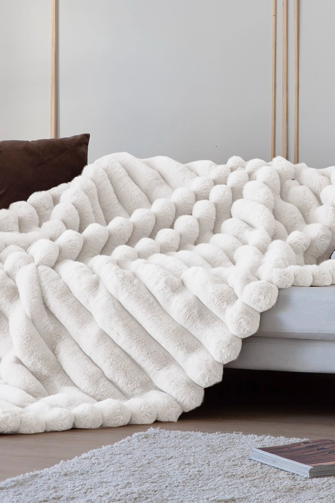 Réalisé en 100 % polyester, ce plaid se distingue par sa finition "Coralline" de haute qualité, reconnue pour son extrême douceur et sa légèreté. Le tissage présente un superbe effet côtelé (ribbed) en relief, qui donne du volume à la matière et capture la lumière pour un rendu esthétique sophistiqué. Cette fibre synthétique performante conserve parfaitement la chaleur corporelle tout en restant respirante.